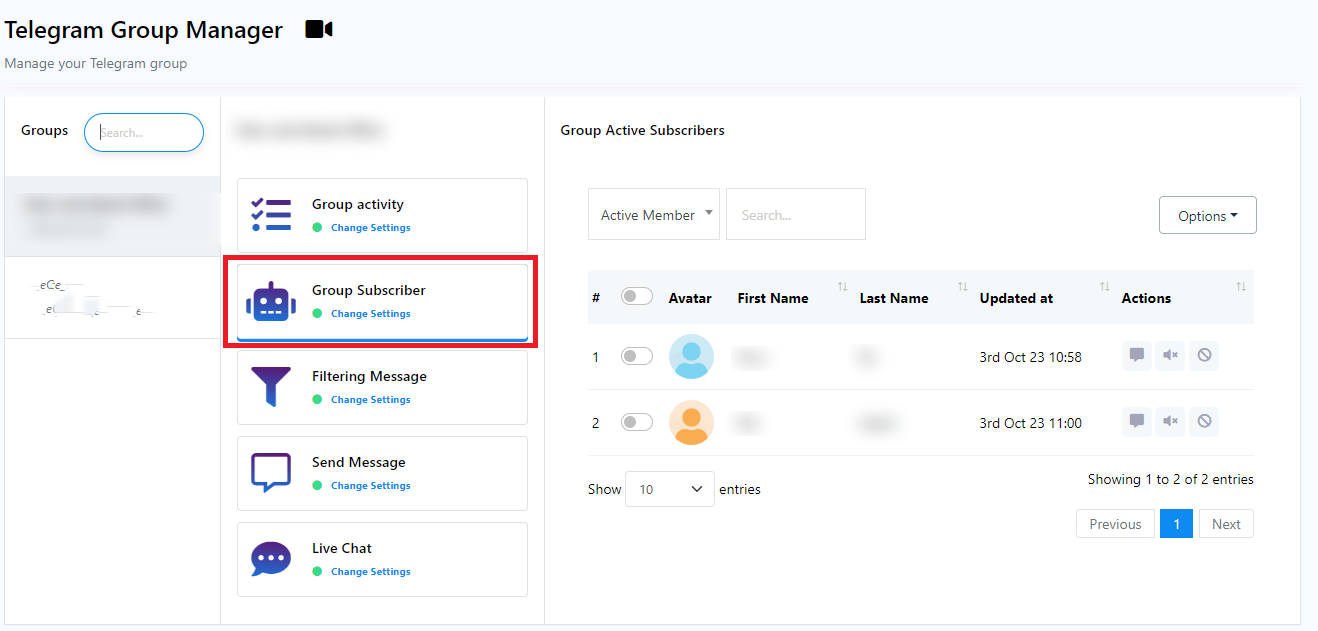 Group Active Subscribers: Within the Group Active Subscribers section, you will find a comprehensive list containing details of all members actively engaged in the group. This list offers valuable insights into your group`s membership.