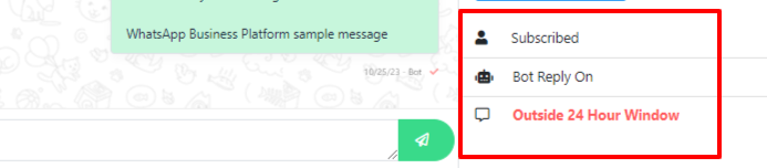You`ll see subscriber information, including whether the user has unsubscribed, the bot reply status, and whether the subscriber is within or outside of the 24-hour window.